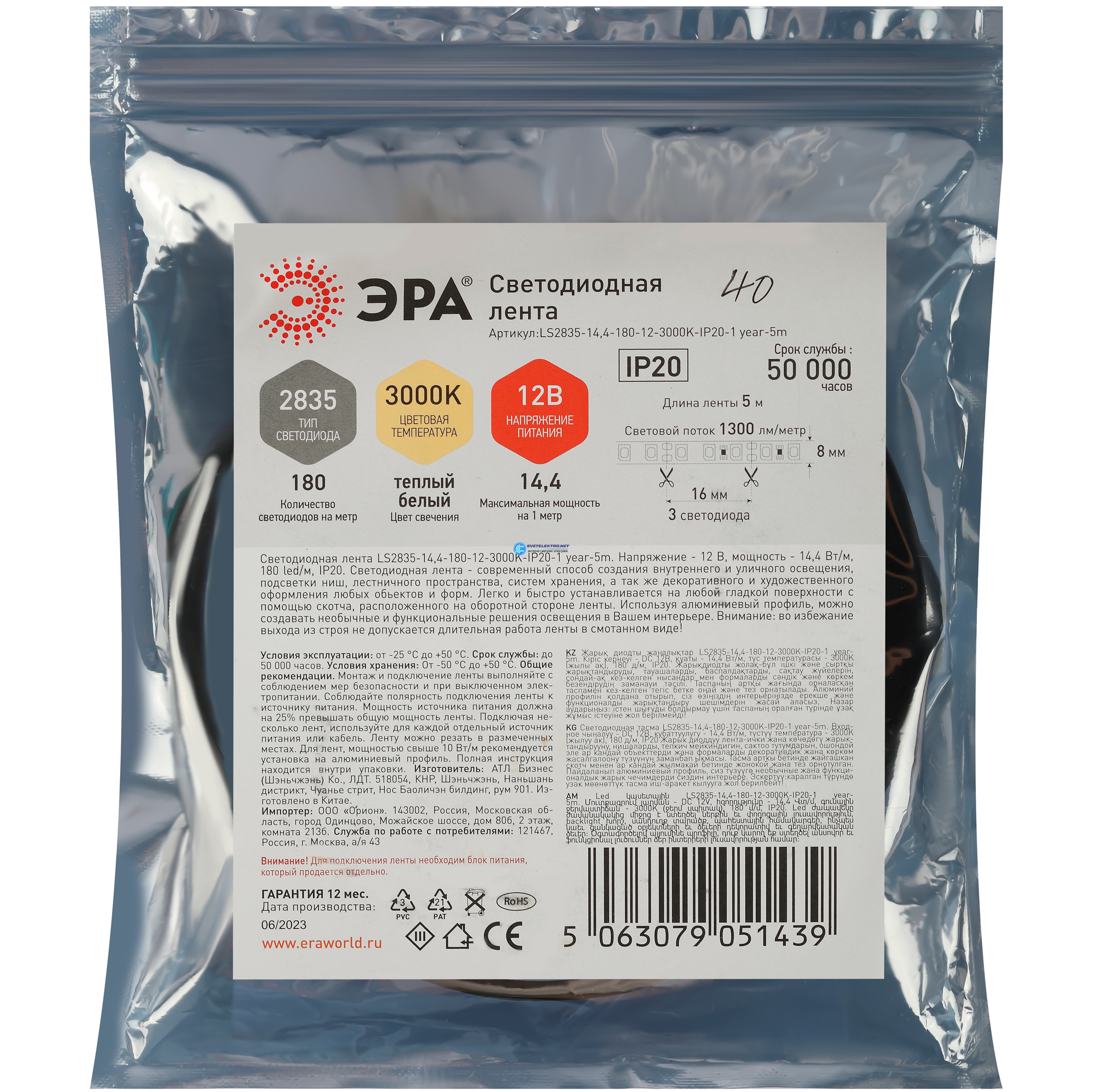 Светодиодная лента LS2835-14,4-180-12-3000K-IP20-1 year-5m теплый белый 5м, код Б0059903, производитель ЭРА