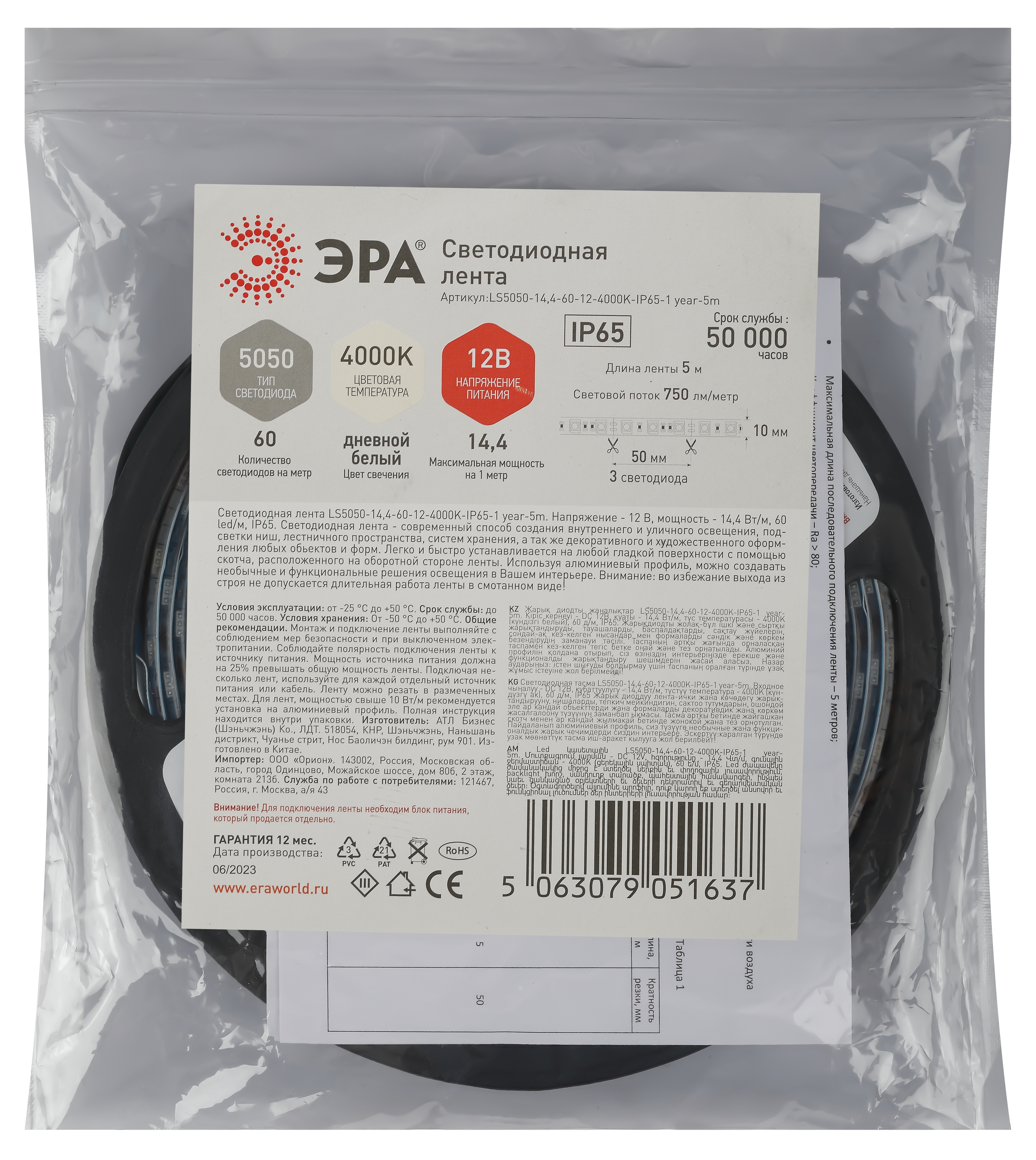Светодиодная лента LS5050-14,4-60-12-4000K-IP65-1 year-5m дневной белый 5м, код Б0059913, производитель ЭРА