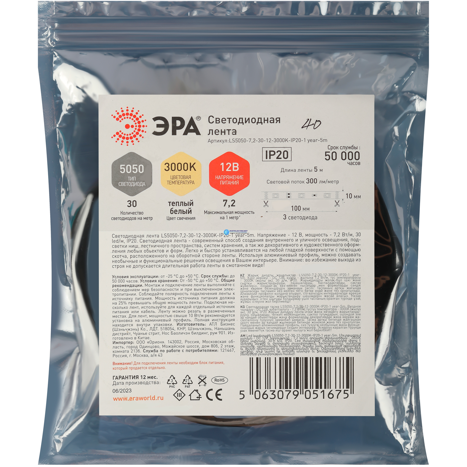 Светодиодная лента LS5050-7,2-30-12-3000K-IP20-1 year-5m теплый белый 5м, код Б0059915, производитель ЭРА