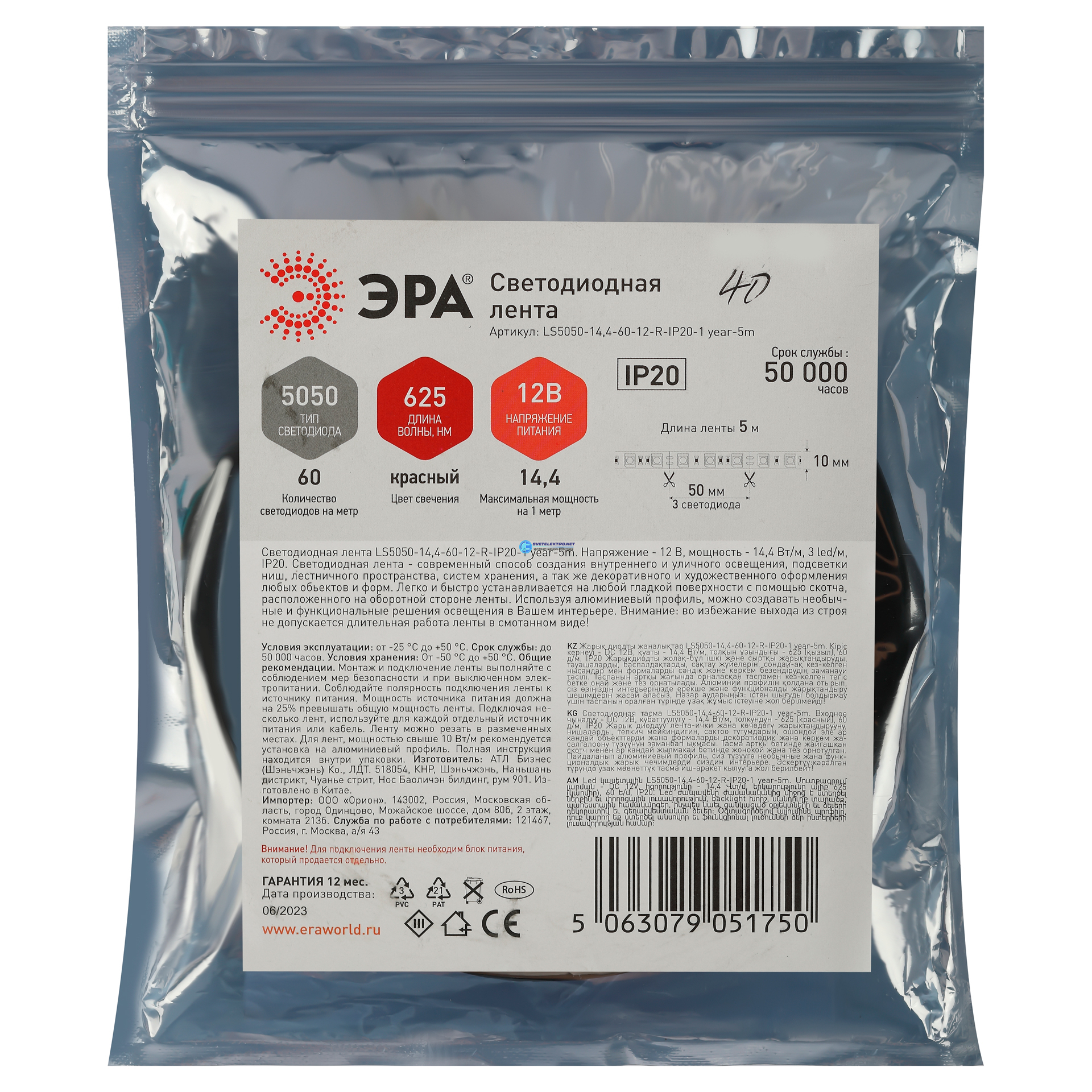 Светодиодная лента LS5050-14,4-60-12-R-IP20-1 year-5m красный 5м, код Б0059919, производитель ЭРА