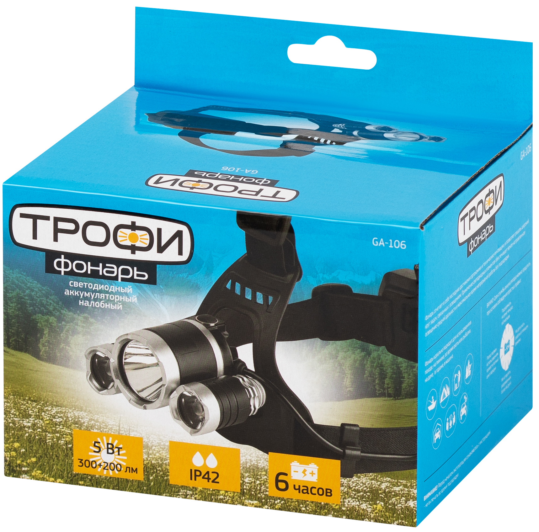 Фонарь налобный светодиодный Трофи GA-106 аккумуляторный 4 режима трехламповый High Power Headla, код Б0069573, производитель ЭРА