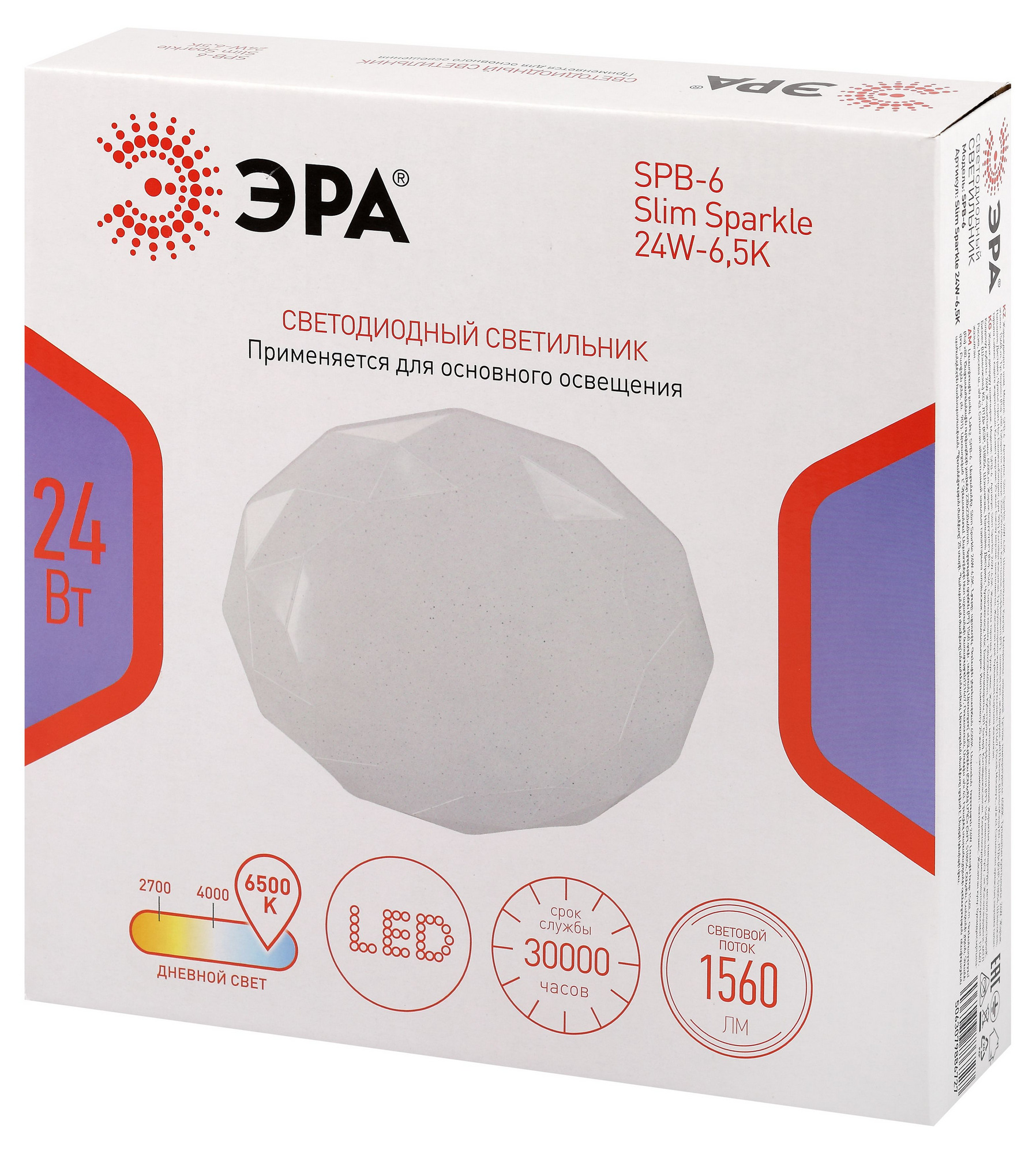 Светильник светодиодный потолочный ДПБ-24Вт 6500К Классик без ДУ SPB-6 WH 24W Slim Sparkle, код Б0069788, производитель ЭРА