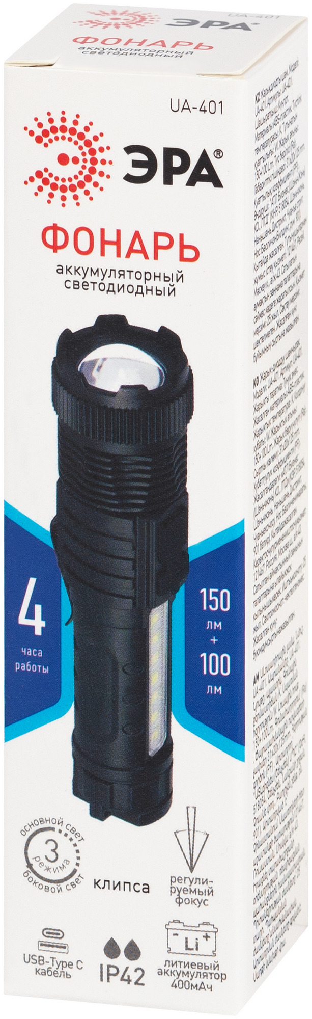 Фонарь светодиодный UA-401 универсальный аккумуляторный Вт LED + Вт COB оптический Zoom режима магнит type C, код Б0069803, производитель ЭРА