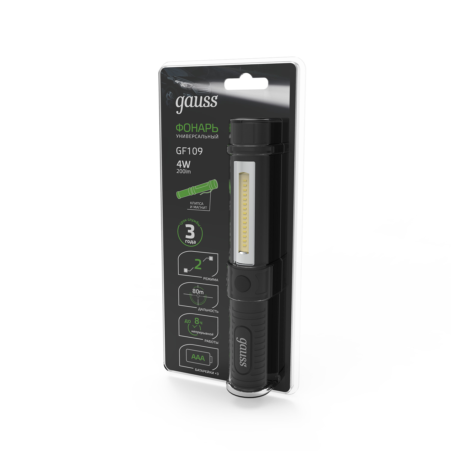 Фонарь ручной светодиодный LED 4 Вт 200 Лм модель черный на батарейках 3xAAA, код GF109, производитель GAUSS