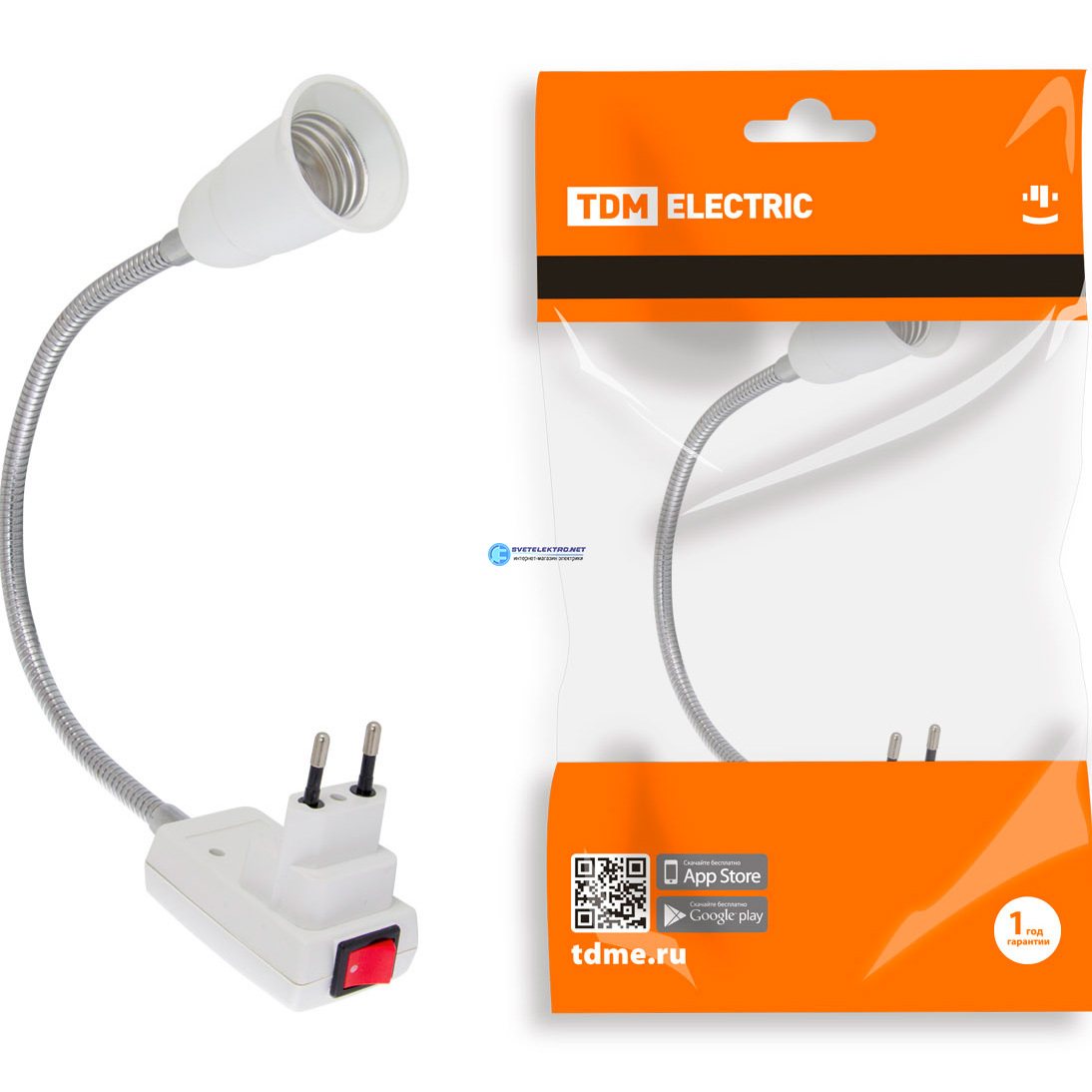 Переходник вилка Е27 гибкий 300мм с выключателем белый, код SQ0335-1011, производитель TDM