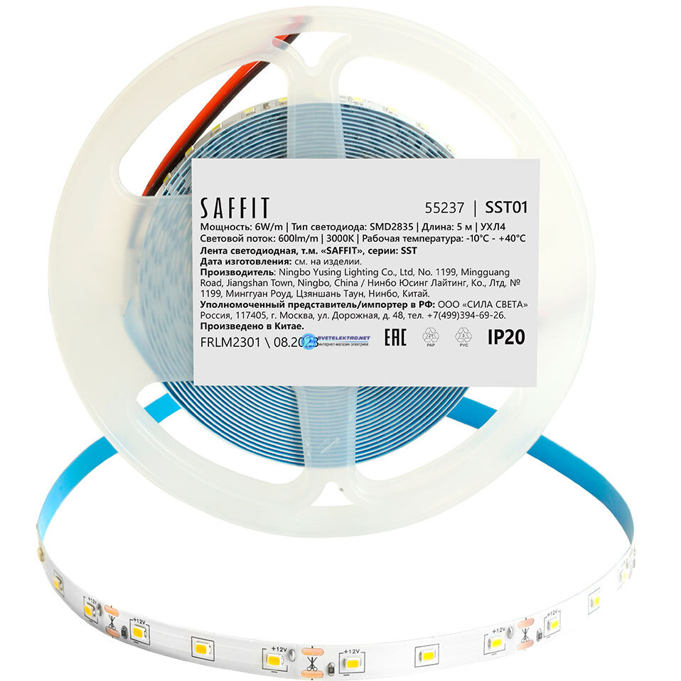 Лента светодиодная LEDх60/м 5м 6w/m 12в 3000К, код 55237, производитель SAFFIT