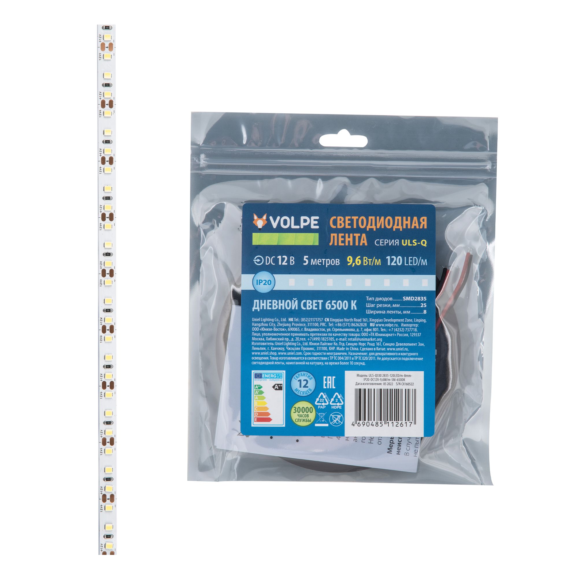 Гибкая светодиодная лента на самоклеящейся основе. ULS-Q330 2835-120LED/m-8mm-IP20-DC12V-9,6W/m-5M-6500K Катушка 5 м. в герметичной упаковке. Дневной UL-00004539 Uniel