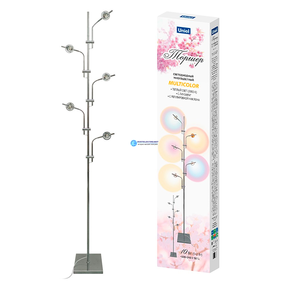 Торшер напольный светодиодный 5х2 Вт c регулировкой наклона с линзами Сменные светофильтры в комплекте Механический выключатель Металл Хром ULM-T640 5 UL-00012154 Uniel