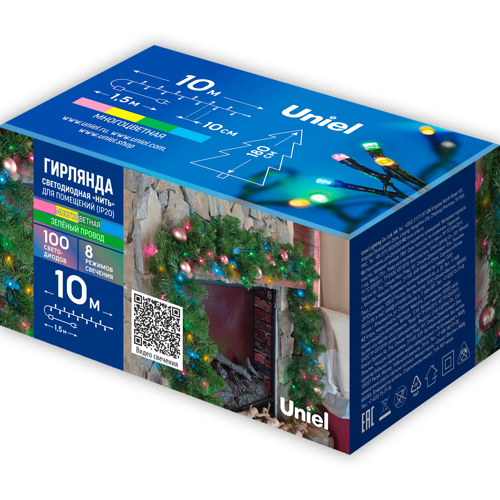 Гирлянда светодиодная 10м 100 светодиодов Голубой желтый зеленый розовый свет Провод зеленый, код UL-00012358, производитель Uniel