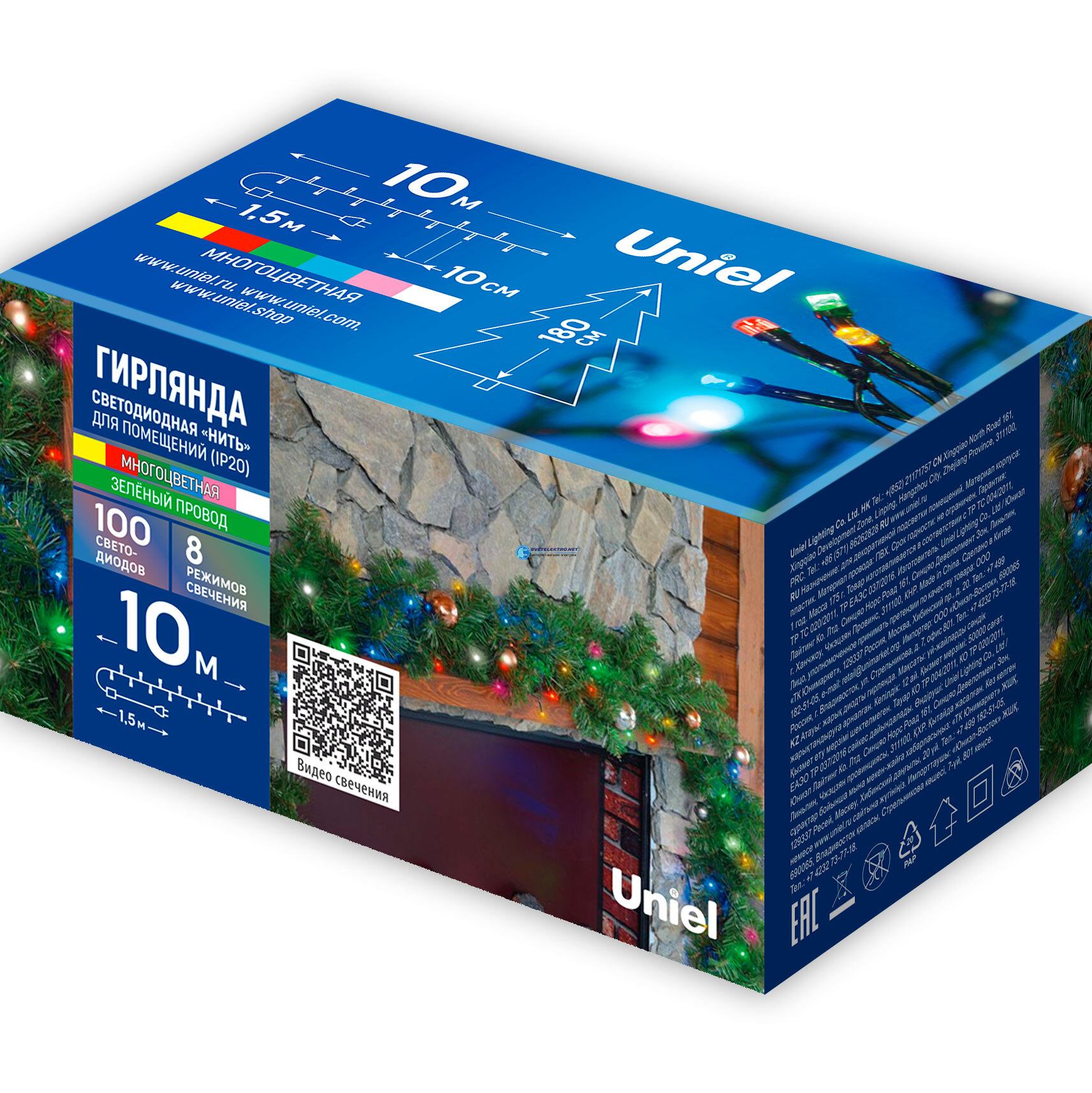 Гирлянда светодиодная 10м 100 светодиодов Белый желтый зеленый красный розовый синий свет Провод зеленый, код UL-00012359, производитель Uniel