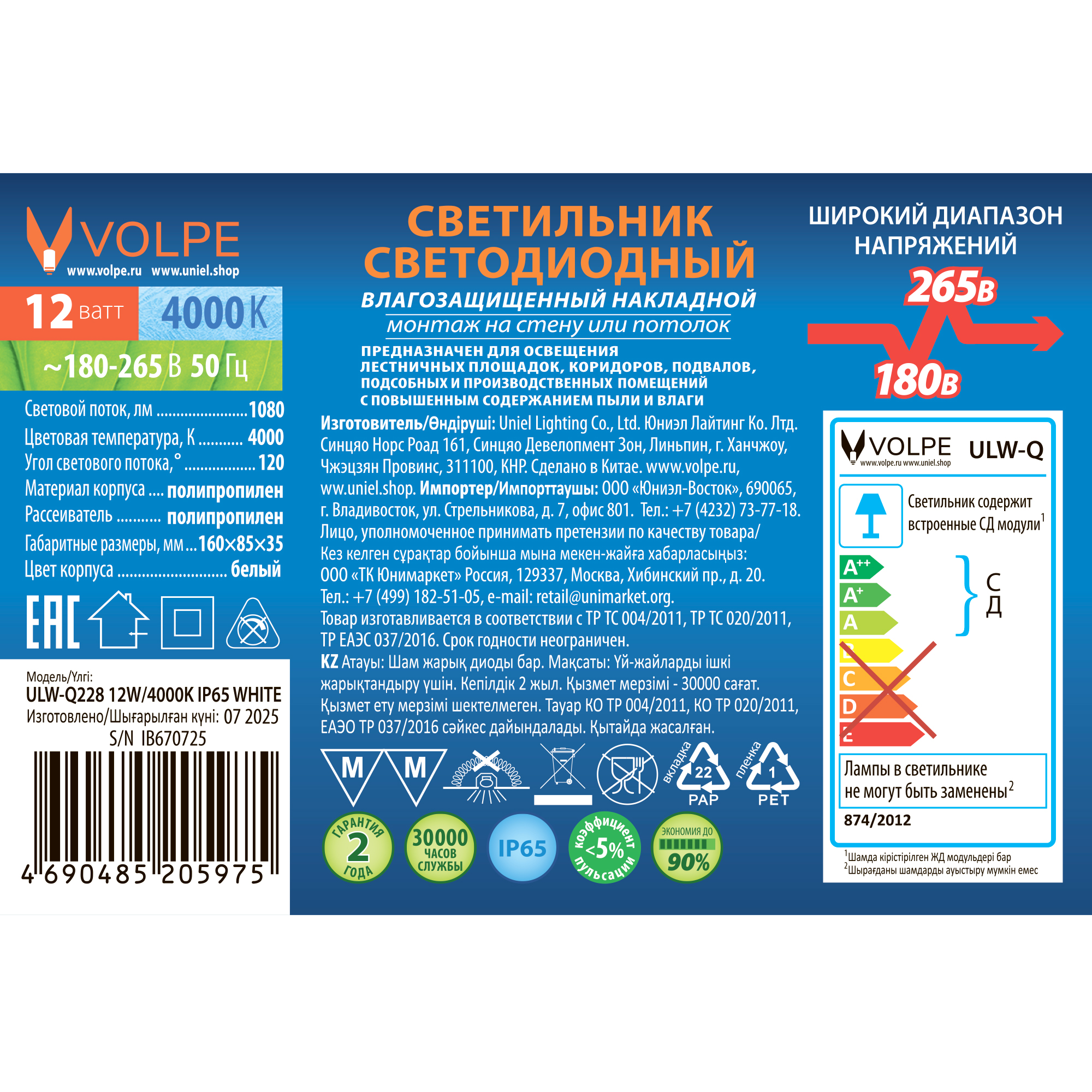 | Комплектация: | светильник светодиодный в упаковке - 1 шт.|самонарезающий винт с дюбелем - 2 шт.|инструкция по эксплуатации|гарантийный талон, |