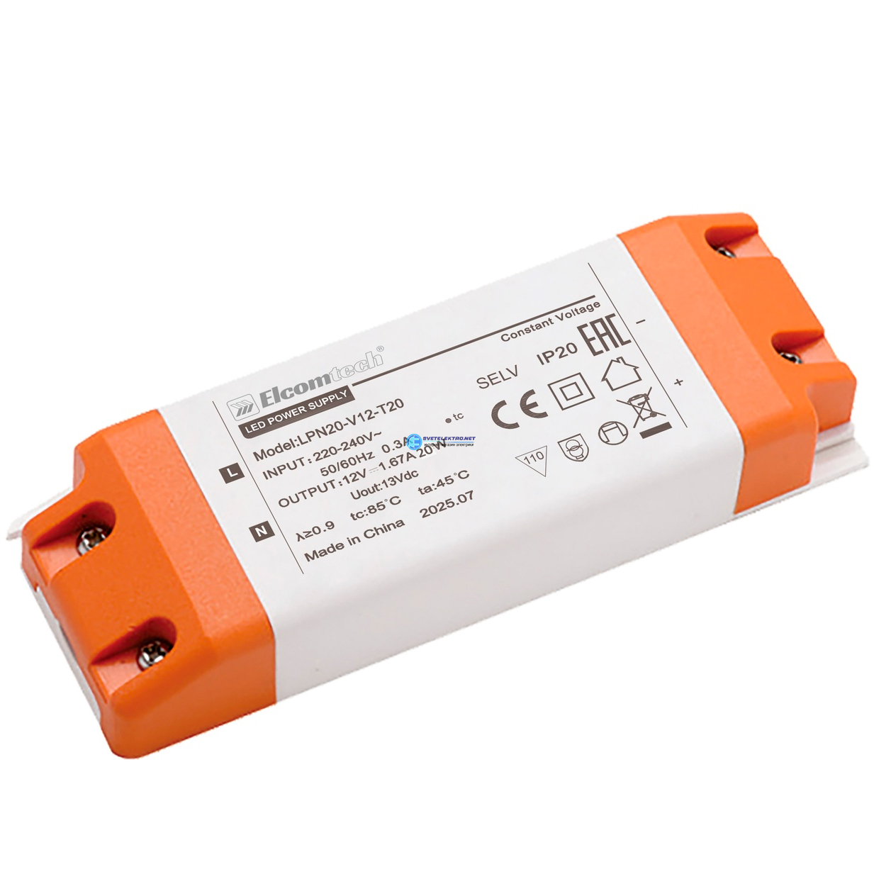 Драйвер LED 20W вход 220-240V, выход 12V 1,67 A LPN20-V12-T20, код УТ-00035239, производитель Elcomtech