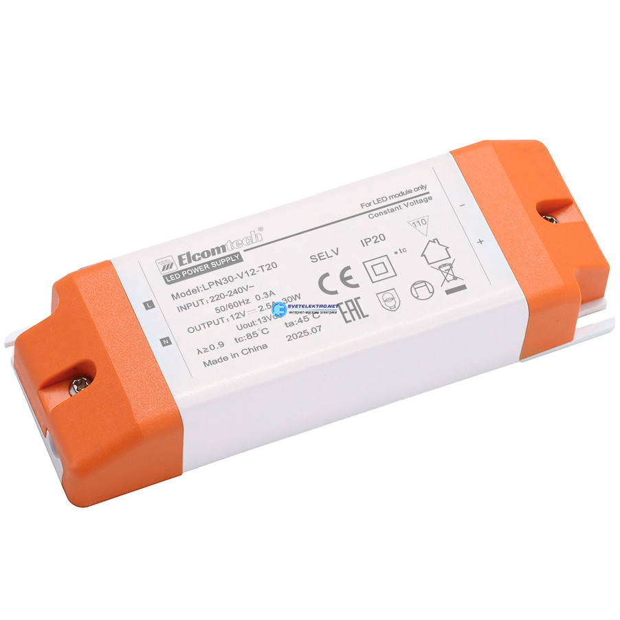Драйвер LED 30W вход 220-240V, выход 12V 2,5 A LPN30-V12-T20, код УТ-00035241, производитель Elcomtech