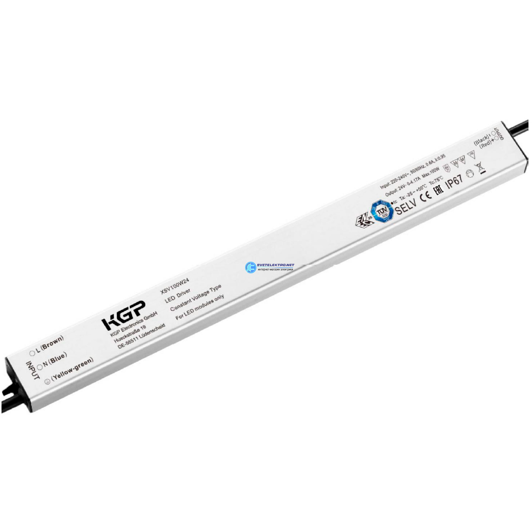 Блок питания AC-DC, 160Вт, IP67, вход 176…264В AC, 47…63Гц/175…280В DC, выход 48В/3.34А, изоляция 3000В AC, в корпусе 350х30х21мм, -25…+50°С, код XSV160W48, производитель KGP