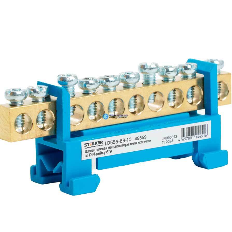 Шина N на DIN-изоляторе 6x9 тип стойка 10 выводов синий LD556-69-10, код 49559, производитель Stekker