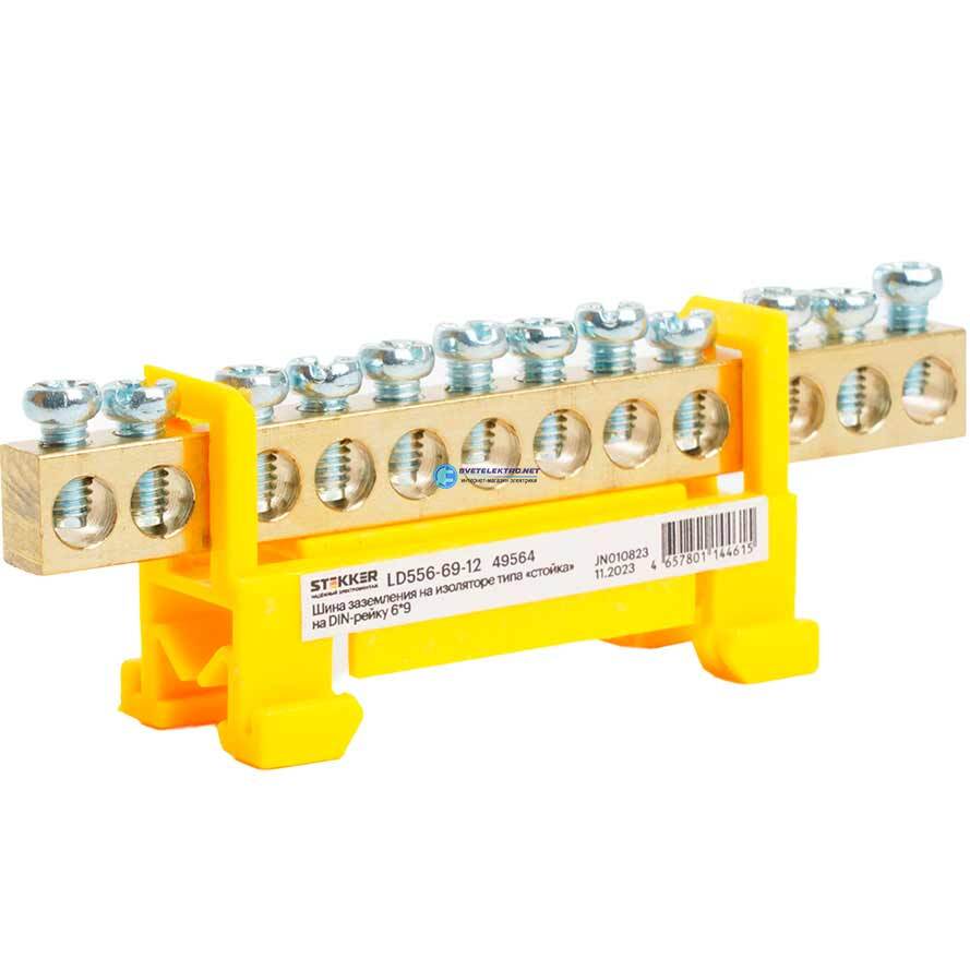 Шина PE на DIN-изоляторе 6x9 тип стойка 12 выводов желтый LD556-69-12, код 49564, производитель Stekker