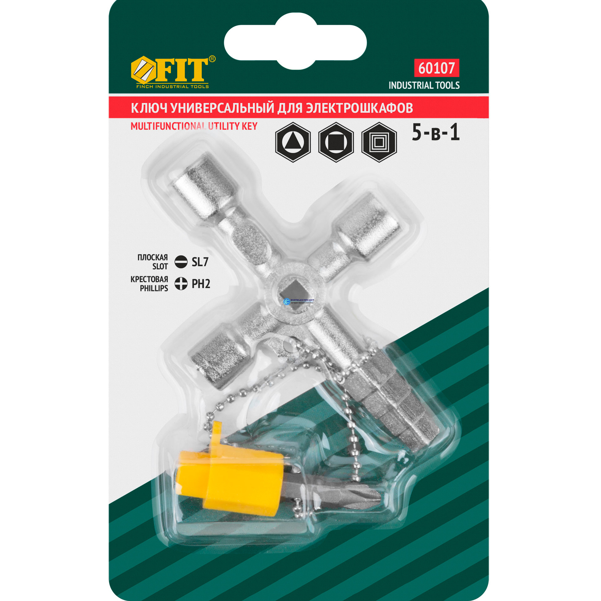 Ключ универсальный для электрошкафов 5-в-1, двусторонняя CrV бита PH2/SL7, код 60107, производитель FIT