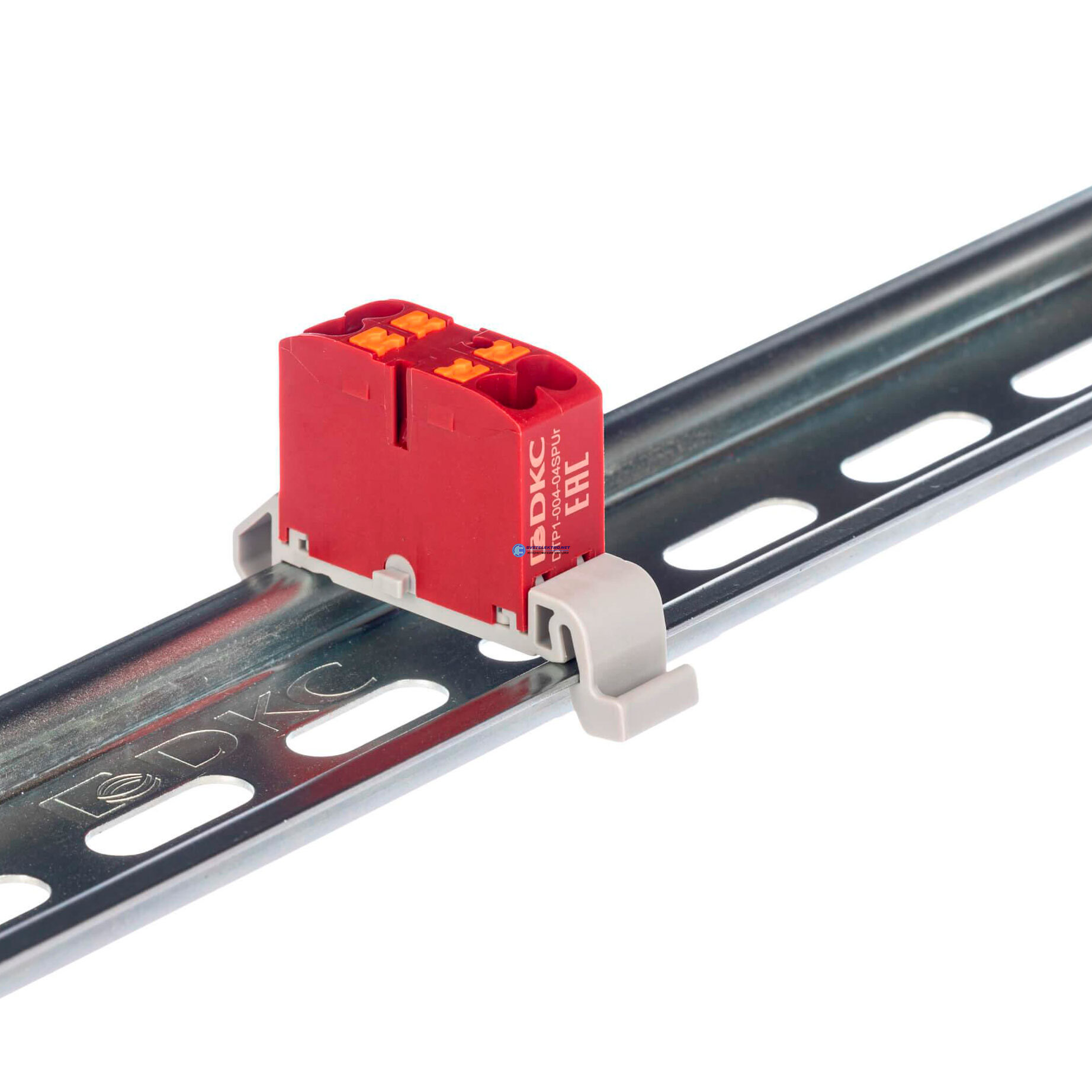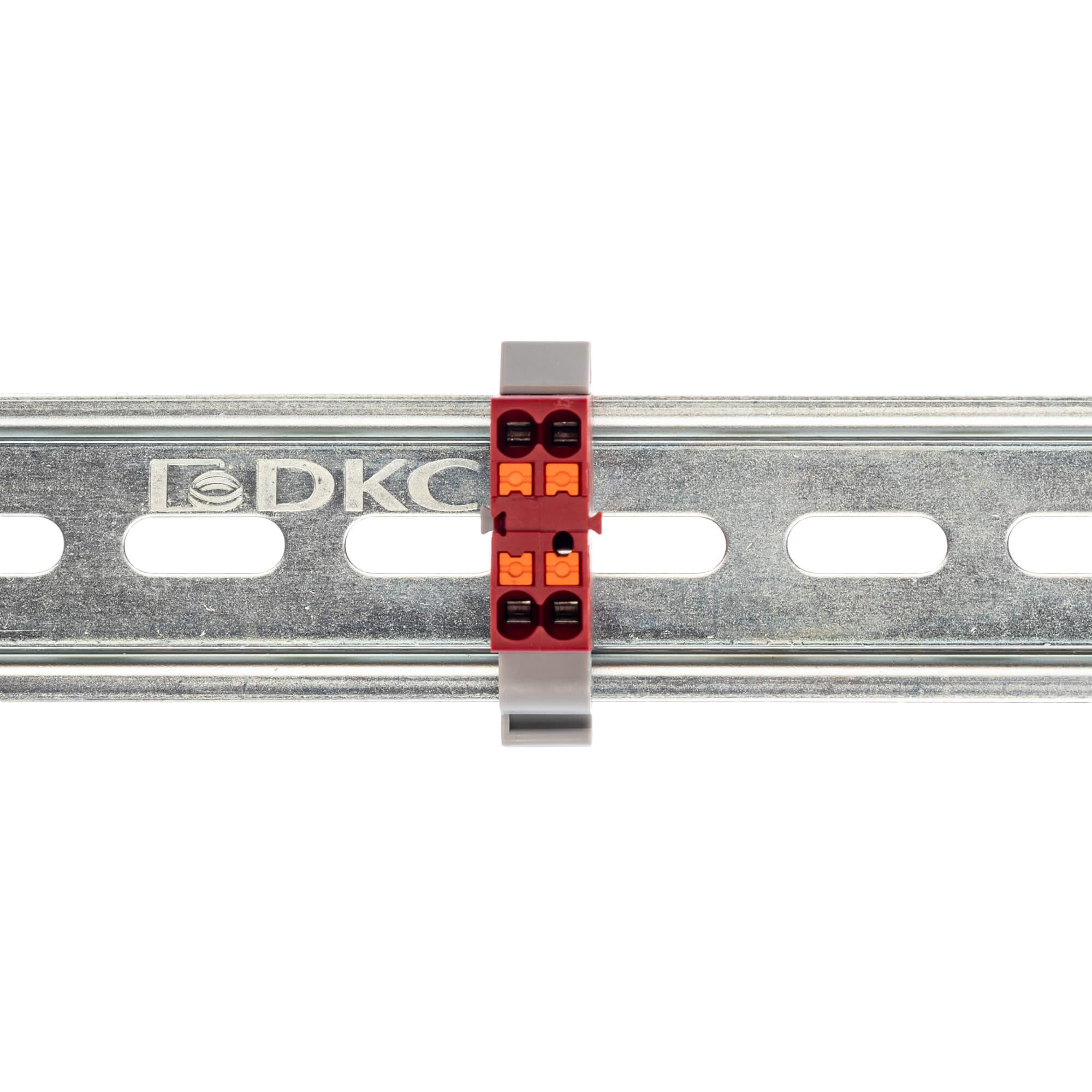 Блок распределительный с гориз. адаптером на рейку шириной 35мм, зажим push-in, точки подключения 2,5 кв.мм, красный, код DTP1-004-04SPUR-H, производитель DKC