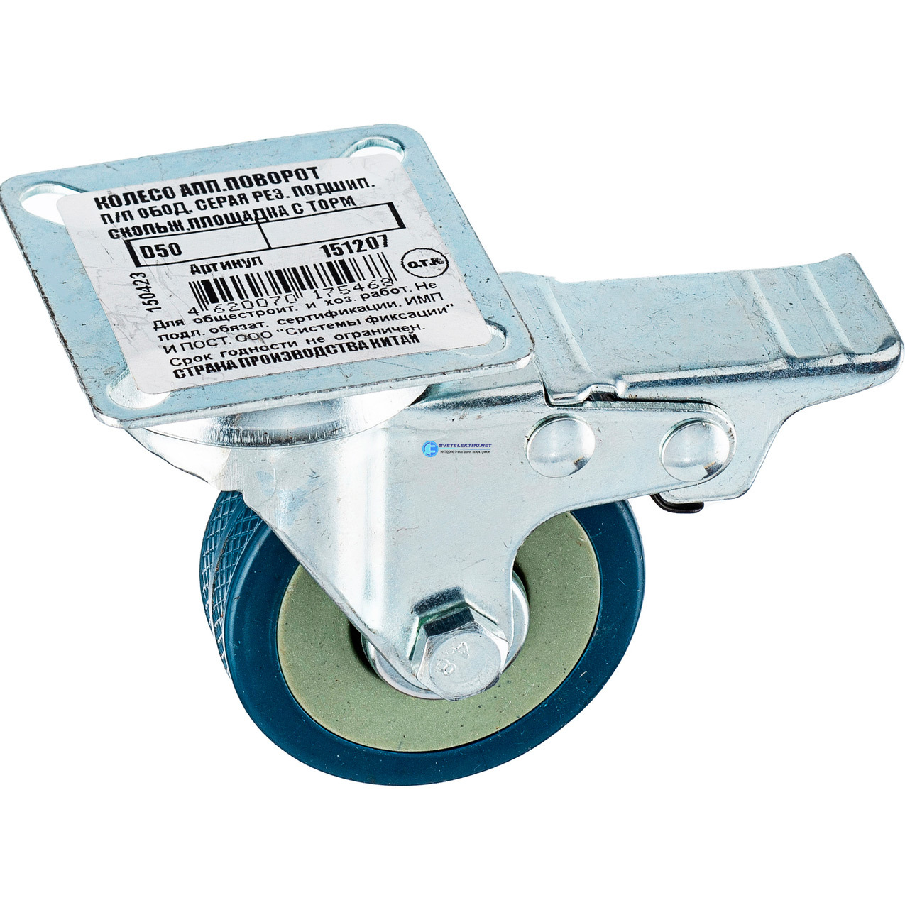 Колесо аппаратное поворотное п/п обод резина сер. подшипник скольжения площадка d50 с тормозом (уп.1шт), код 151207, производитель Tech-KREP