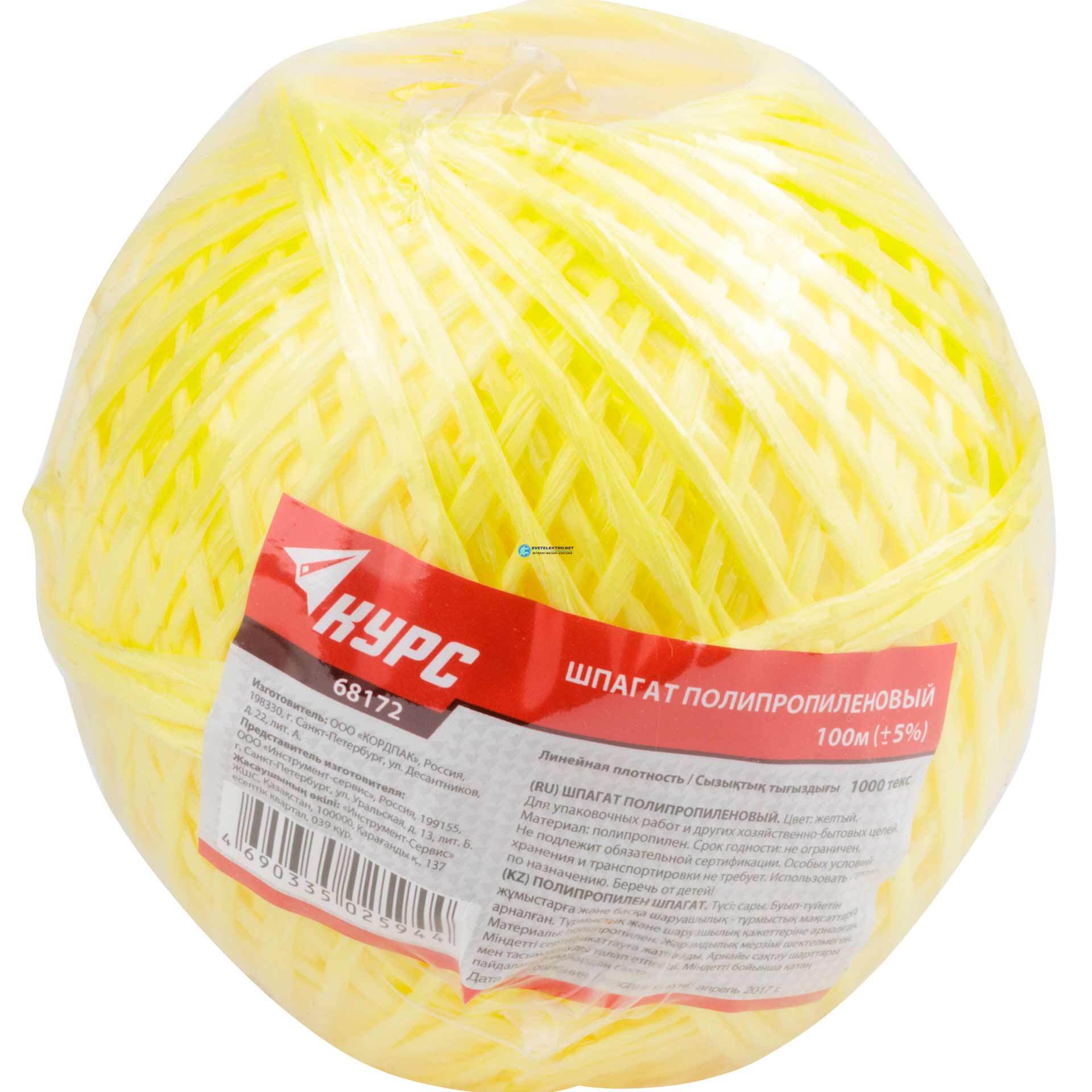 Шпагат полипропиленовый 1000 текс, 100 м желтый, код 68172, производитель КУРС РОС