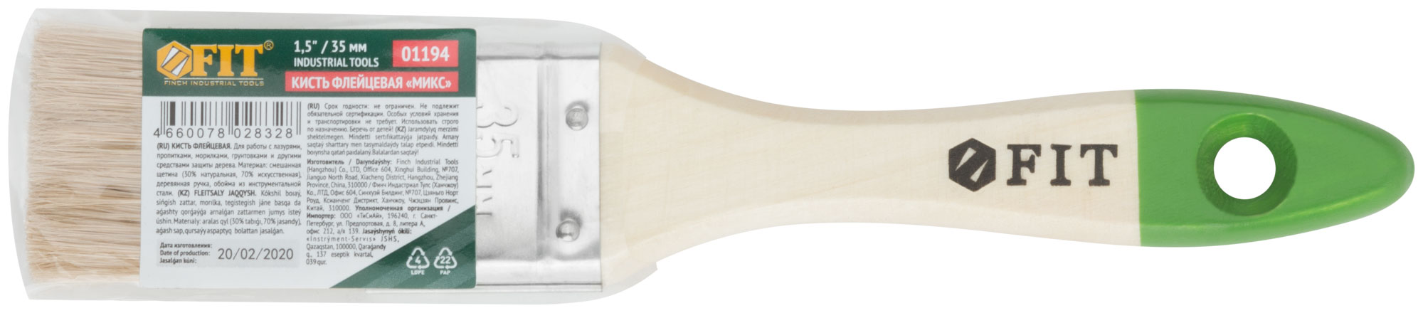 Кисть флейцевая ''Микс'', смешанная натуральная и искусственная щетина, деревянная ручка 1.5'' (35 мм), код 01194, производитель FIT