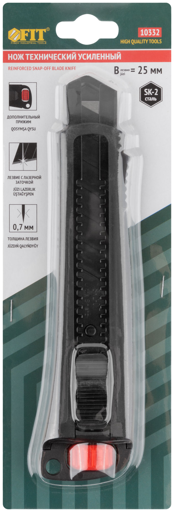 Нож технический 25 мм усиленный прорезиненный, дополнит. пластиковый прижим, черный, Профи, код 10332, производитель FIT
