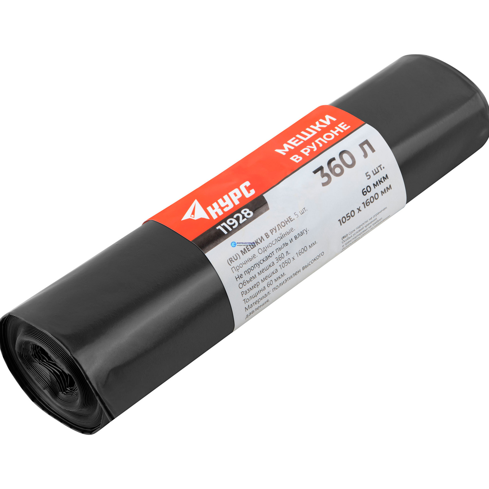 Мешки для строительного мусора, ПВД прочные, 360 л, 1050х1600 мм, толщина 60 мкм, 5 шт., код 11928, производитель КУРС РОС