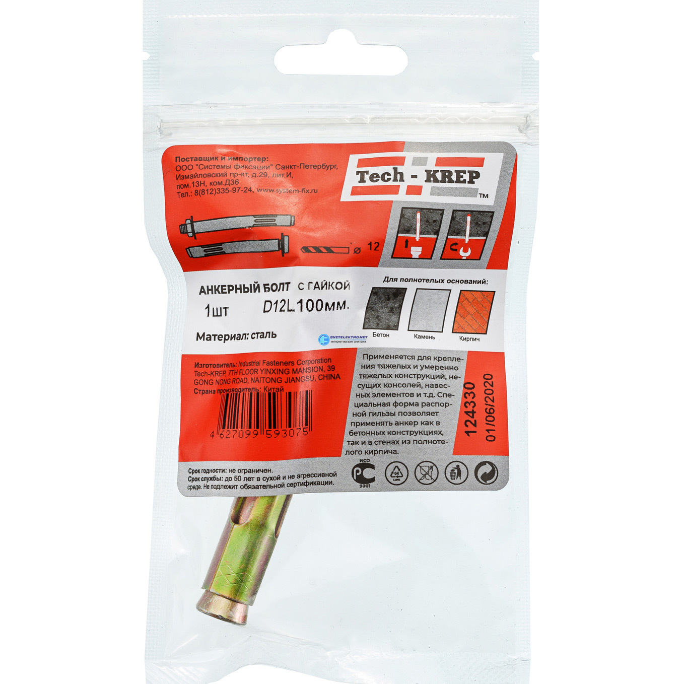 Болт анкерный 12х100 с гайкой (1шт), код 124330, производитель Tech-KREP