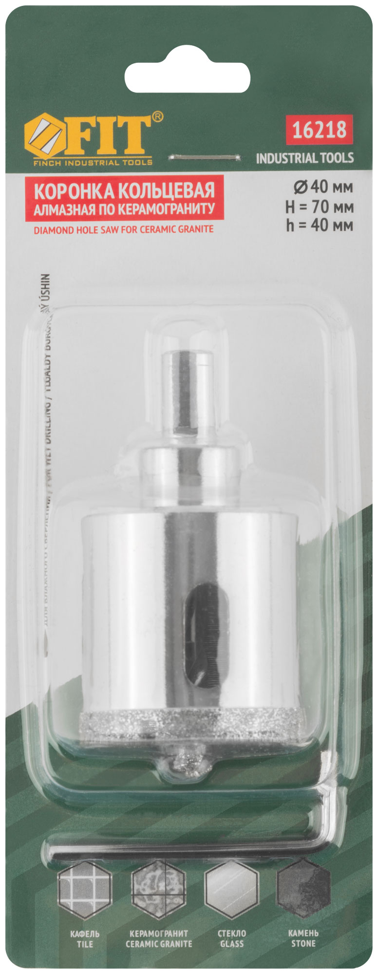 Коронка кольцевая по керамограниту, камню и кафелю алмазная с центровочным сверлом 40х67 мм, код 16218, производитель FIT
