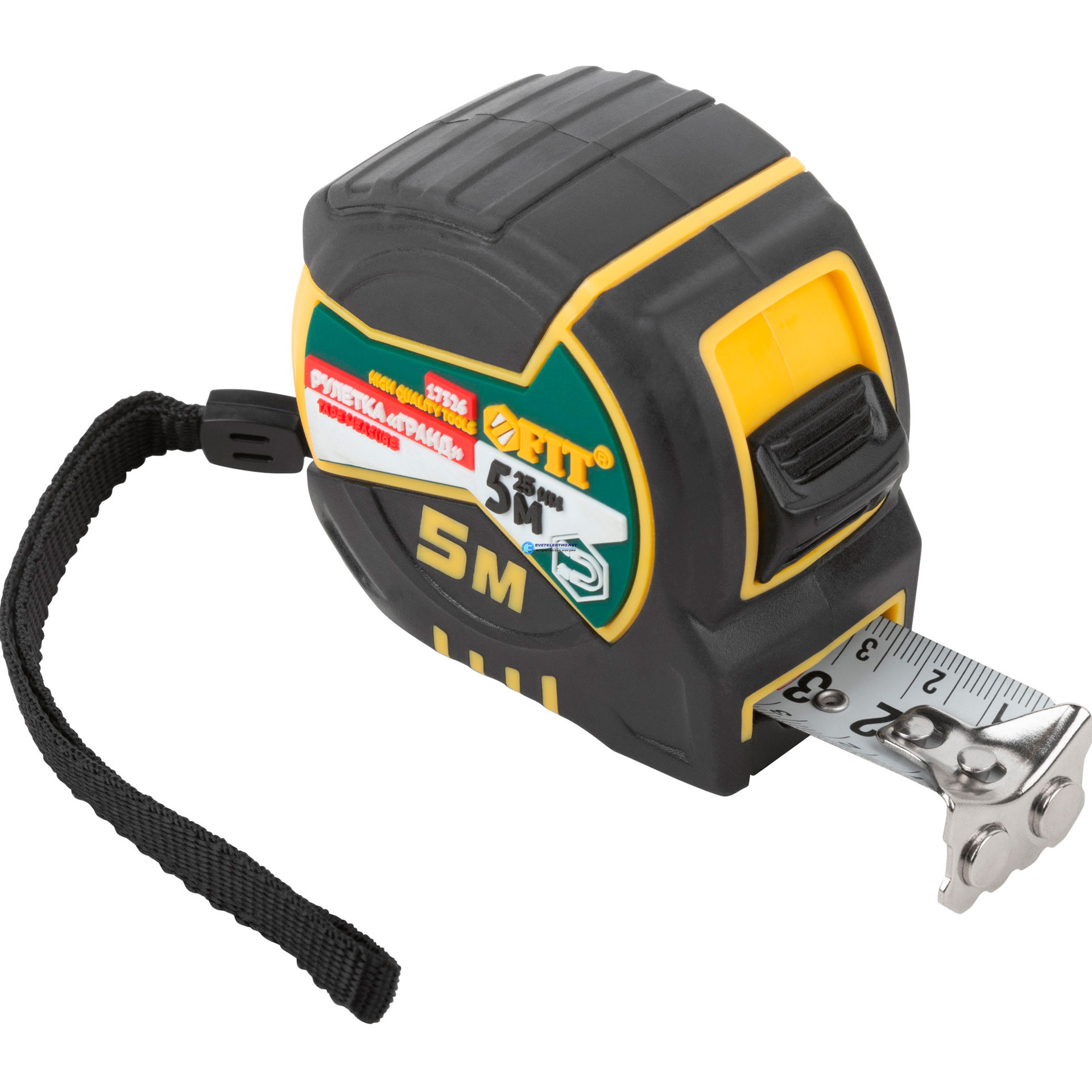 "Рулетка ""Гранд"", калибр.лента, нейлон.покр., магн.крючок, двойной стопор, прорезин.корпус 5 м х 25 мм", код 17326, производитель FIT