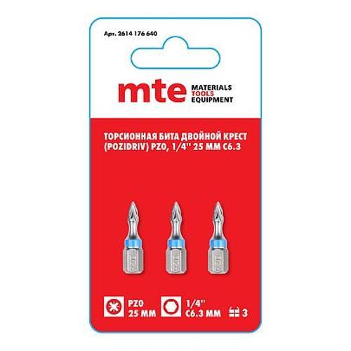 Бита с профилем Pozidriv (двойной крест) PZ0, длина 25 мм, хвостовик С6,3 мм, торсионная (3 шт), код 2614176640, производитель mte
