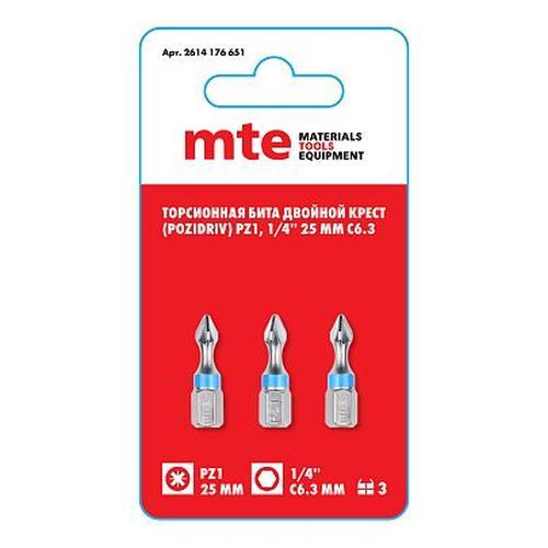 Бита с профилем Pozidriv (двойной крест) PZ1, длина 25 мм, хвостовик С6,3 мм, торсионная (3 шт), код 2614176651, производитель mte