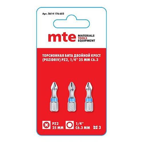 Бита с профилем Pozidriv (двойной крест) PZ2, длина 25 мм, хвостовик С6,3 мм, торсионная (3 шт), код 2614176652, производитель mte