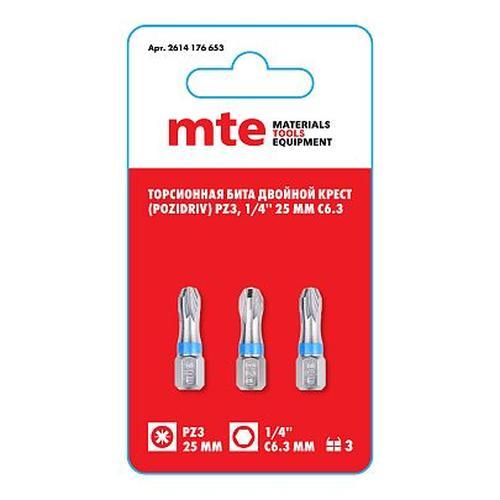 Бита с профилем Pozidriv (двойной крест) PZ3, длина 25 мм, хвостовик С6,3 мм, торсионная (3 шт) 2614176653 mte