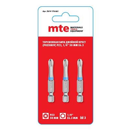 Бита с профилем Pozidriv (двойной крест) PZ3, длина 50 мм, хвостовик E6,3 мм, торсионная (3 шт), код 2614176661, производитель mte