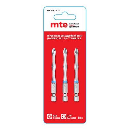 Бита с профилем Pozidriv (двойной крест) PZ2, длина 75 мм, хвостовик E6,3 мм, торсионная (3 шт), код 2614176777, производитель mte
