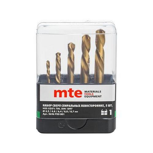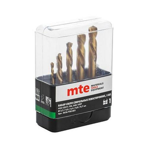 Набор сверл спиральных левосторонних по металлу HSS Co5% TiN PRO DIN 1897 3,2, 4,8, 6,4, 8,0, 8,7 мм, 5 шт., код 2626920001, производитель mte