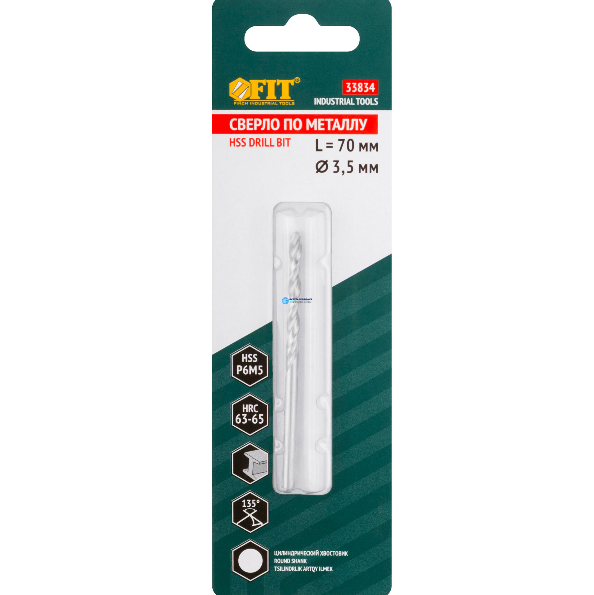 Сверло по металлу HSS полированное, центровочный наконечник, Р6М5, блистер 3,5х70 мм ( 1 шт.), код 33834, производитель FIT