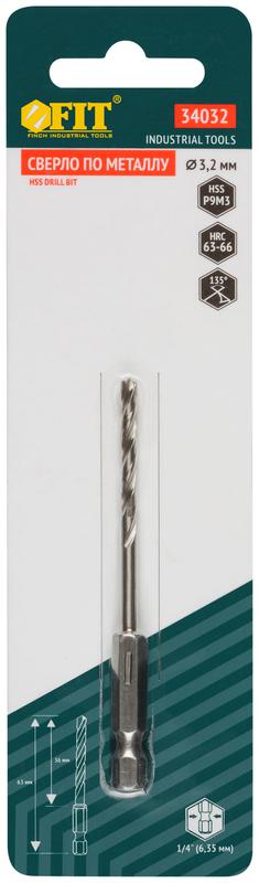 Сверло HSS по металлу,полированное, U-хвостовик под биту, инд.упаковка 3.2 мм, код 34032, производитель FIT