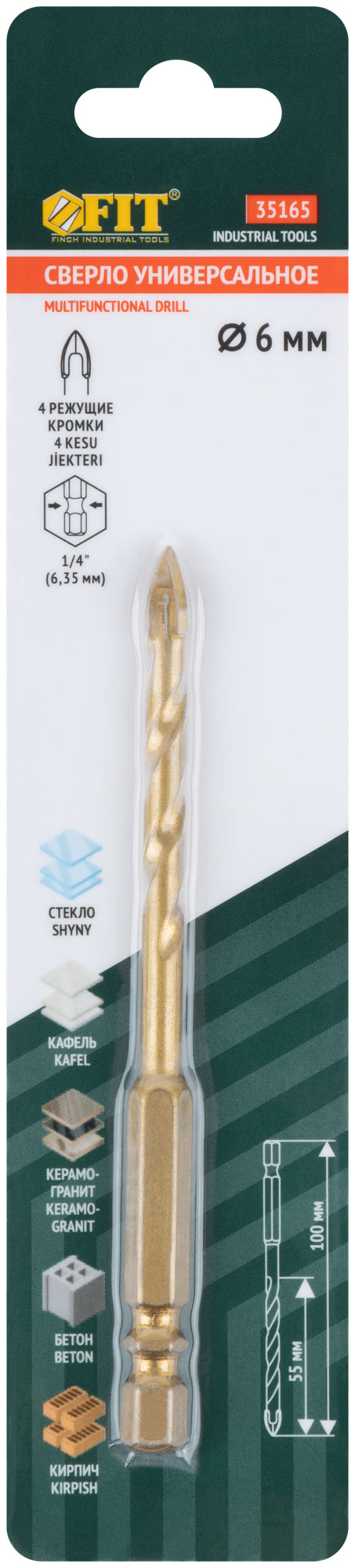 Сверло универсальное, 4 режущие кромки, титановое покрытие, шестигранный U-хвостовик под биту, 6х100 мм, код 35165, производитель FIT