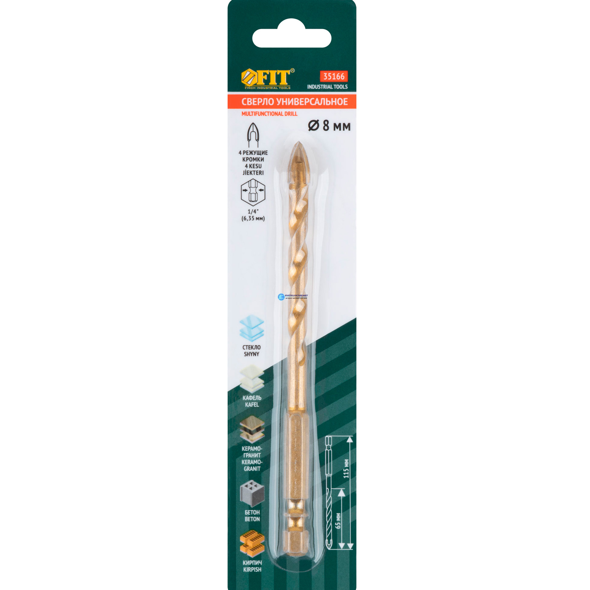 Сверло универсальное, 4 режущие кромки, титановое покрытие, шестигранный U-хвостовик под биту, 8х115 мм, код 35166, производитель FIT