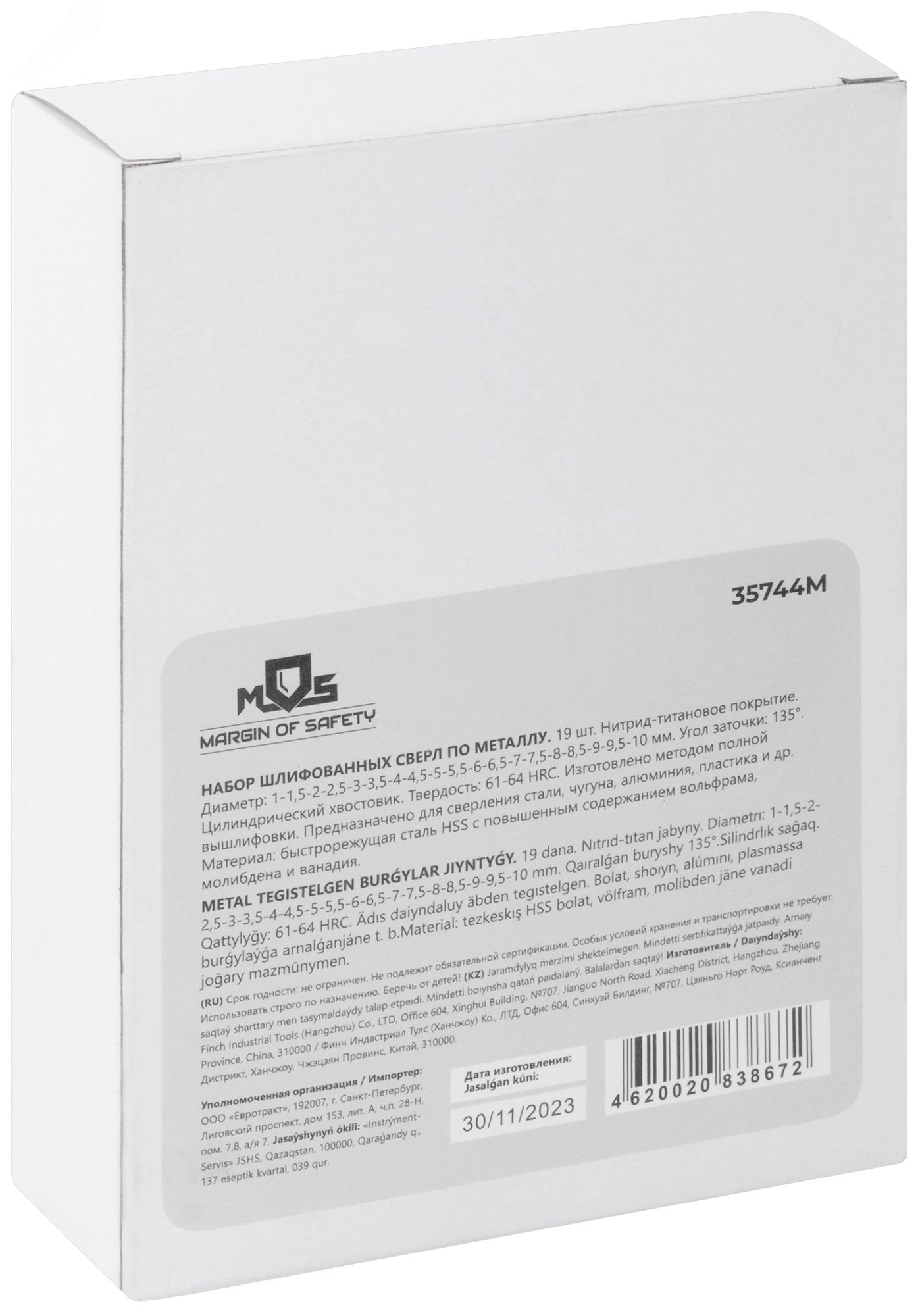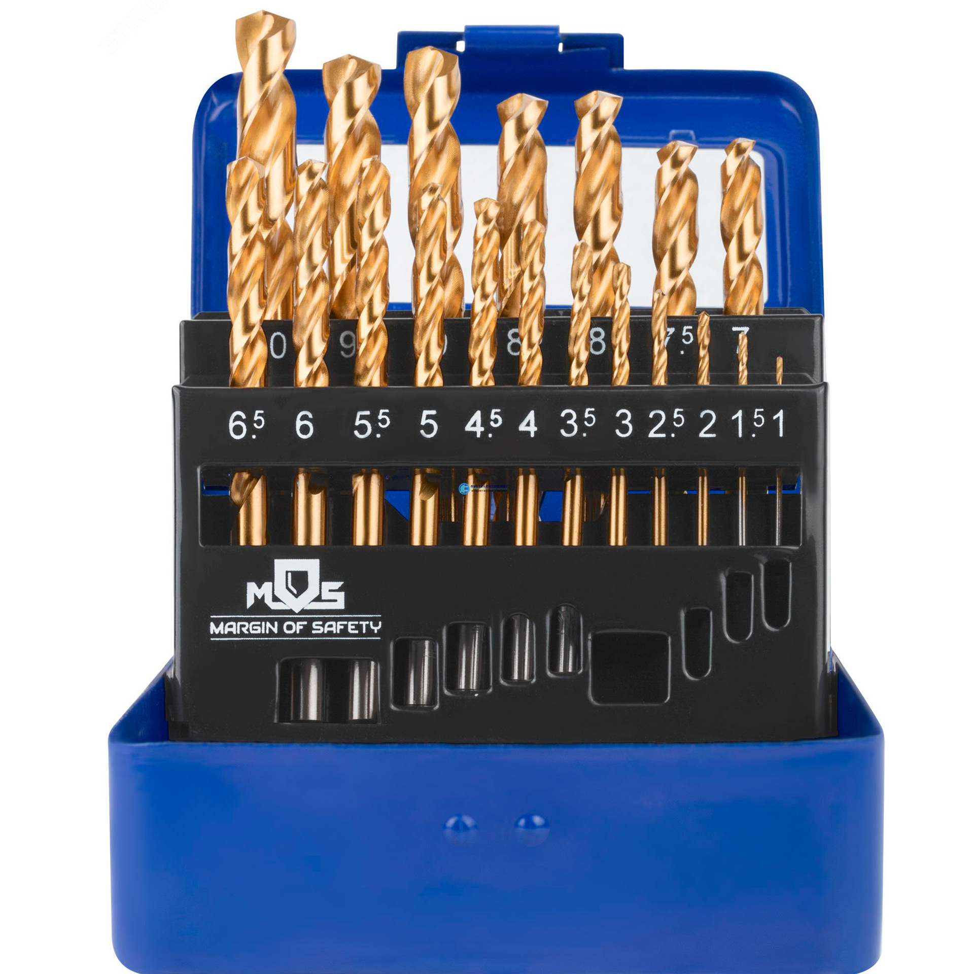 Набор сверл по металлу HSS шлифованные, титановое покрытие, угол заточки 135град, мет.бокс,19 шт. (1-10 мм через 0,5 мм), код 35744М, производитель MOS
