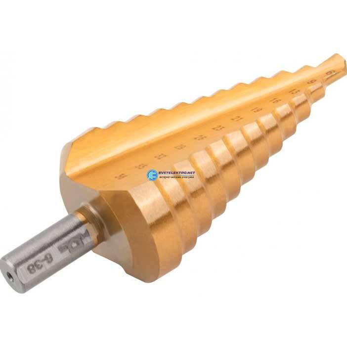 Сверло ступенчатое HSS по металлу, 12 ступеней 6-9-13-16-19-21-23-26-29-32-35-38 мм 36386М MOS