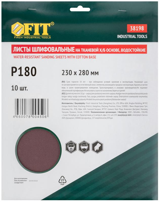 Листы шлифовальные водостойкие на тканевой основе, алюминий-оксидные, Профи 230х280 мм, 10 шт P180, код 38198, производитель FIT