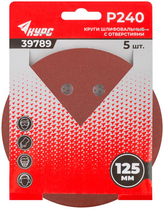 Круги шлифовальные с отверстиями (липучка), алюминий-оксидные, 125 мм, 5 шт Р 240 39789 Курс