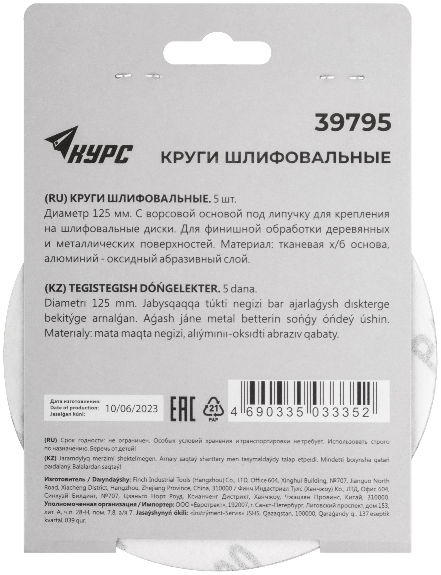 Круги шлифовальные сплошные (липучка), алюминий-оксидные, 125 мм, 5 шт. Р 400 39795 no name