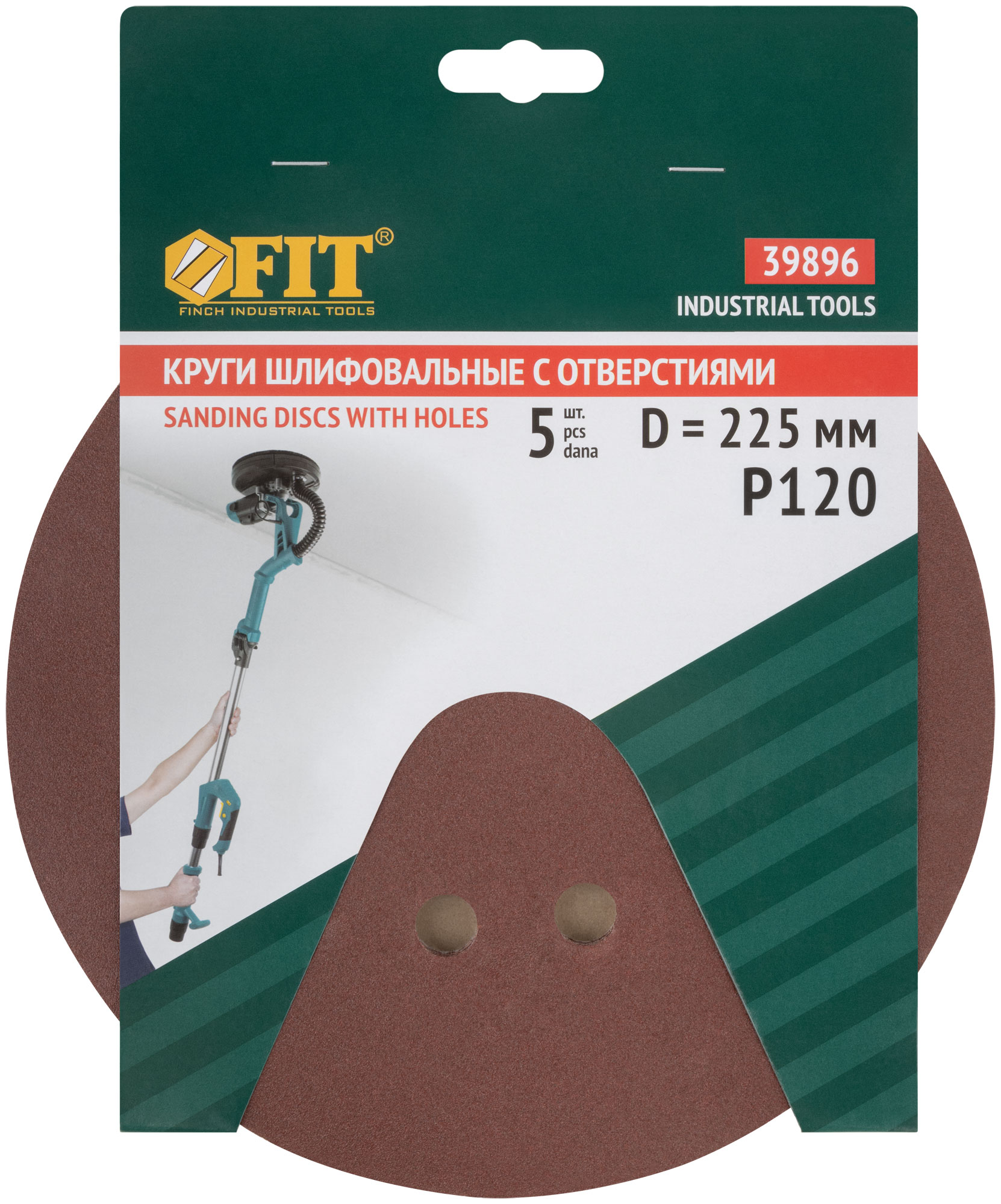 Круги шлифовальные с отверстиями (липучка), алюминий-оксидные, 225 мм, 5 шт. Р 120, код 39896, производитель FIT