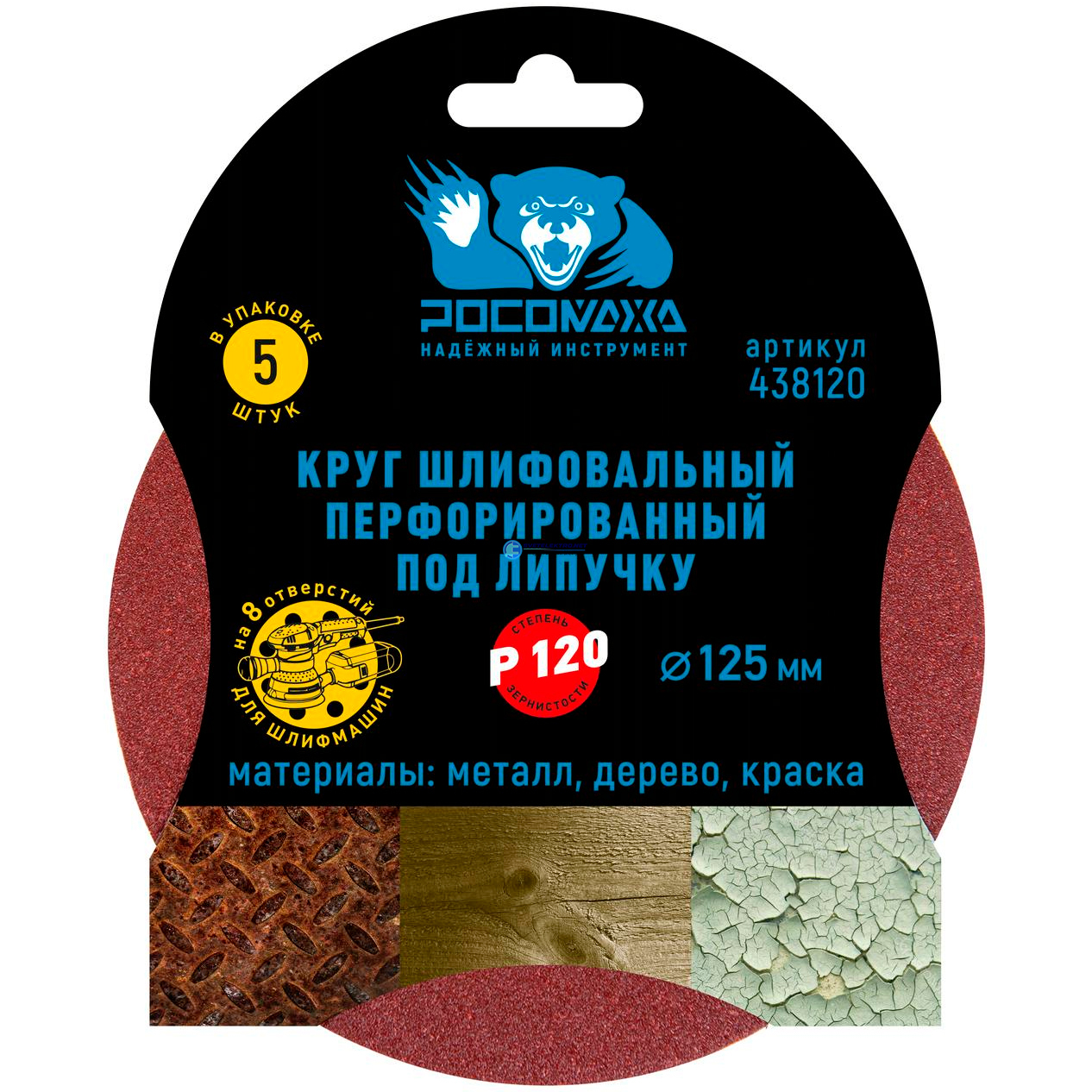 Круг шлифовальный, перфорированный 8 отверстий под липучку 125 мм зерно 120 5 шт уп. 438120 Росомаха
