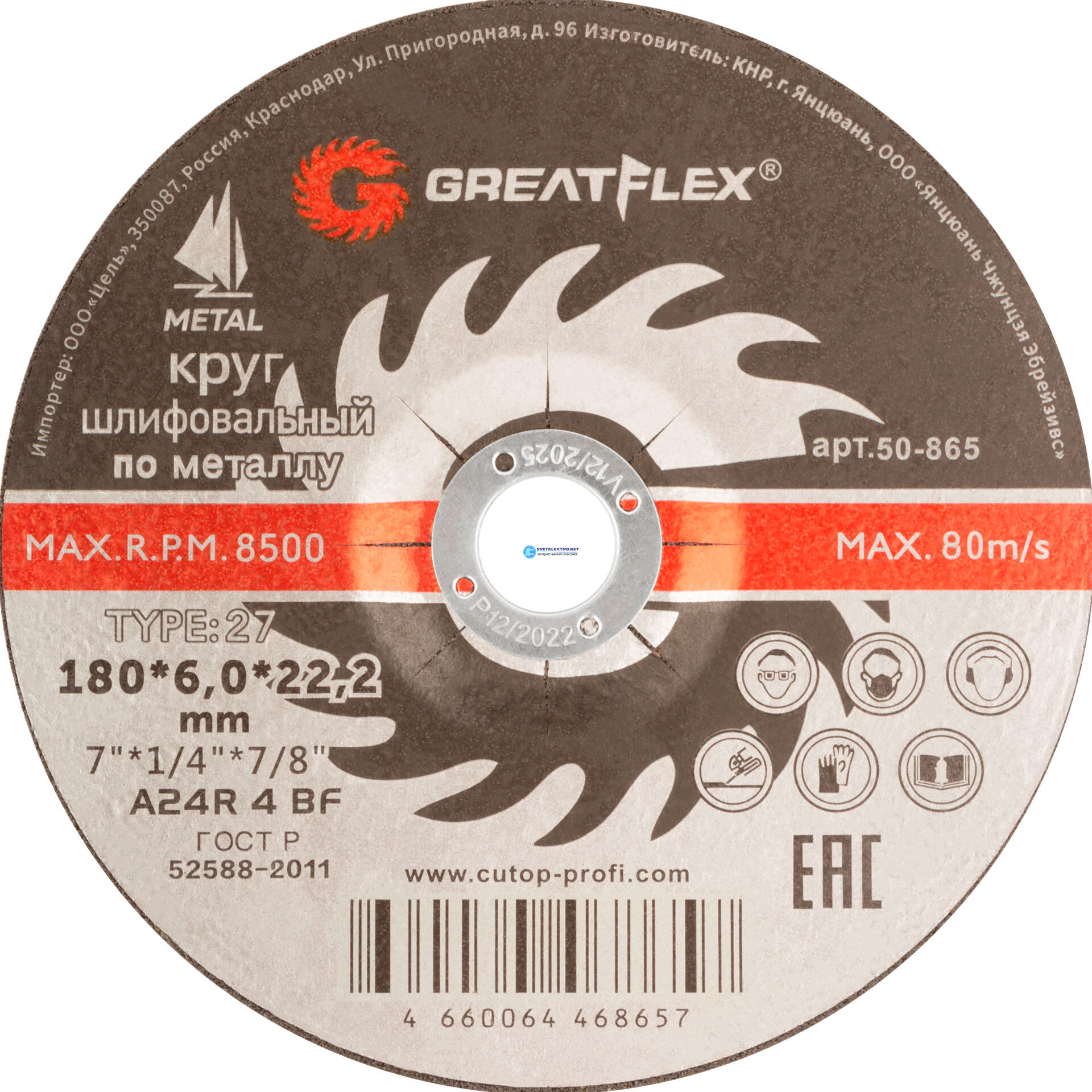 Диск шлифовальный по металлу, Т27-180 х 6.0 х 22,2 мм, код 50-865, производитель Greatflex