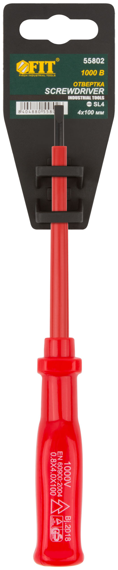 Отвертка изолированная 1000 В, CrV сталь, пластиковая ручка 4х100 мм SL, код 55802, производитель FIT